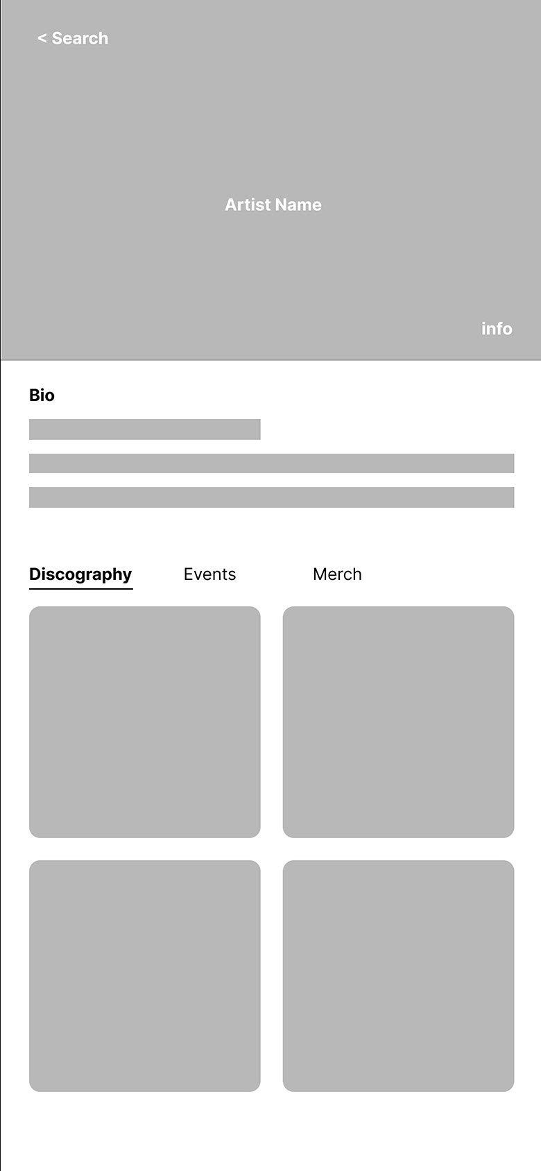 Here’s where I returned to experimenting with tabbed navigation and avatars. Research made clear which CTAs are conventional in music apps and I included them here.